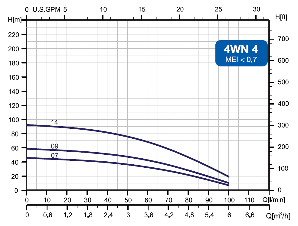 | Kit pompe immergée 4WN 4-9 câble 30m EBARA | Monophasée 230 | ACS | 6 | 59 | 0.75 |